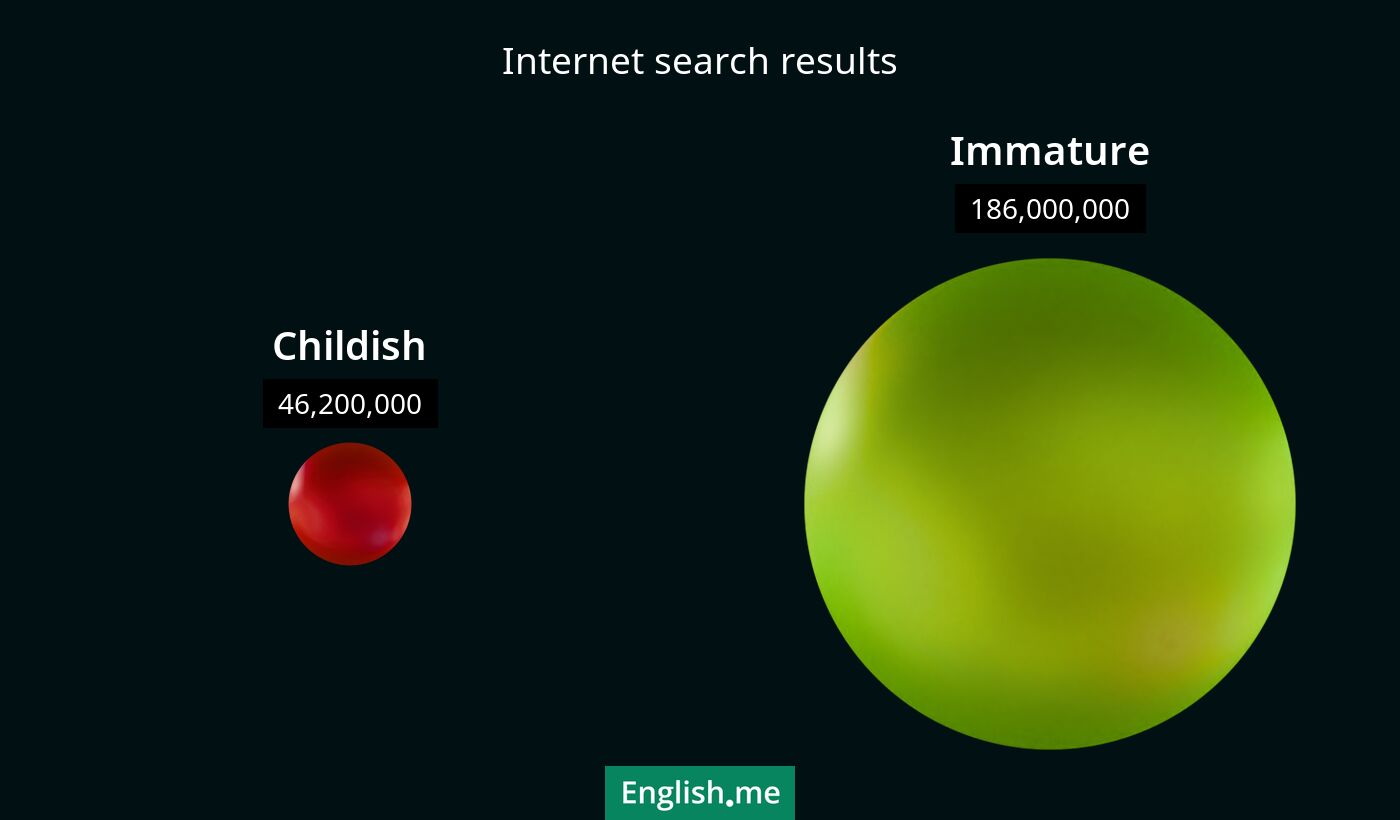 Le mot "childish" est souvent utilisé pour décrire un comportement spécifiquement enfantin ou puéril. "Immature", quant à lui, est plus large et peut désigner toute forme de manque de maturité, pas nécessairement spécifique à l'enfance.