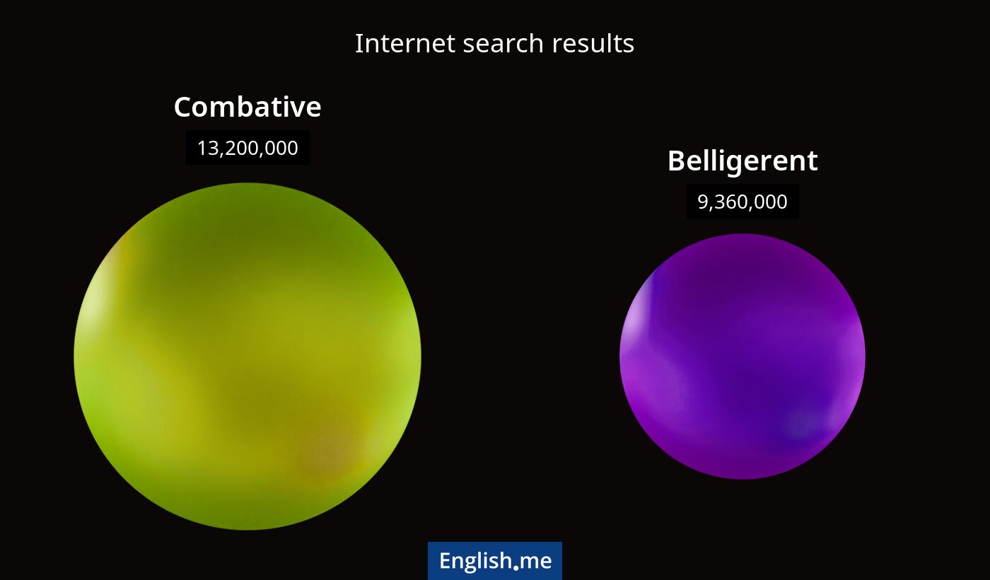 Les deux mots, "combative" et "belligerent", partagent l'idée d'une disposition agressive ou prêt à se battre. Ils sont souvent utilisés pour décrire des personnes ou des comportements qui sont confrontants et agressifs.