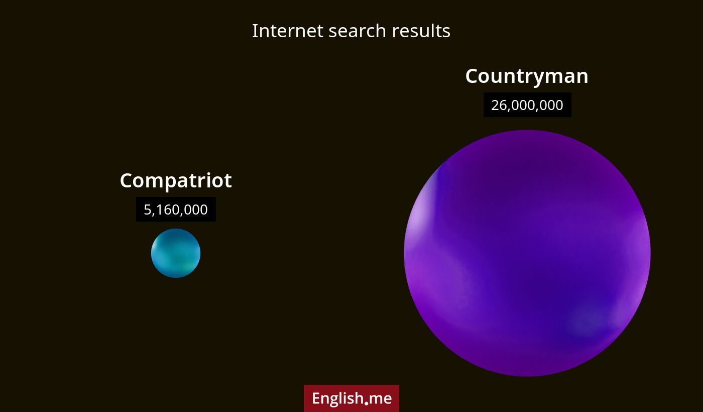 Les deux mots réfèrent à une personne provenant du même pays ou région, et ils peuvent être utilisés pour exprimer un lien partagé entre des personnes du même lieu.