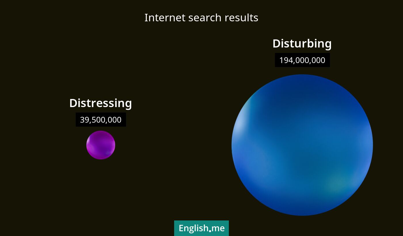 Les mots "distressing" et "disturbing" sont similaires dans le sens où ils décrivent tous deux une expérience ou une perception négative, provoquant des sentiments de malaise, de peur ou de tristesse.