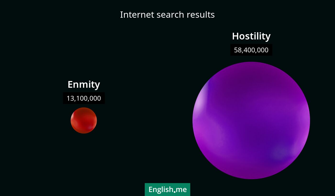 La "enmity" traduit une inimitié, souvent plus durable ou profonde, pouvant dériver de conflits historiques ou personnels. En revanche, la "hostility" peut refléter une attitude agressive ou une opposition active, souvent de manière immédiate ou contextuelle sans nécessairement être durable.