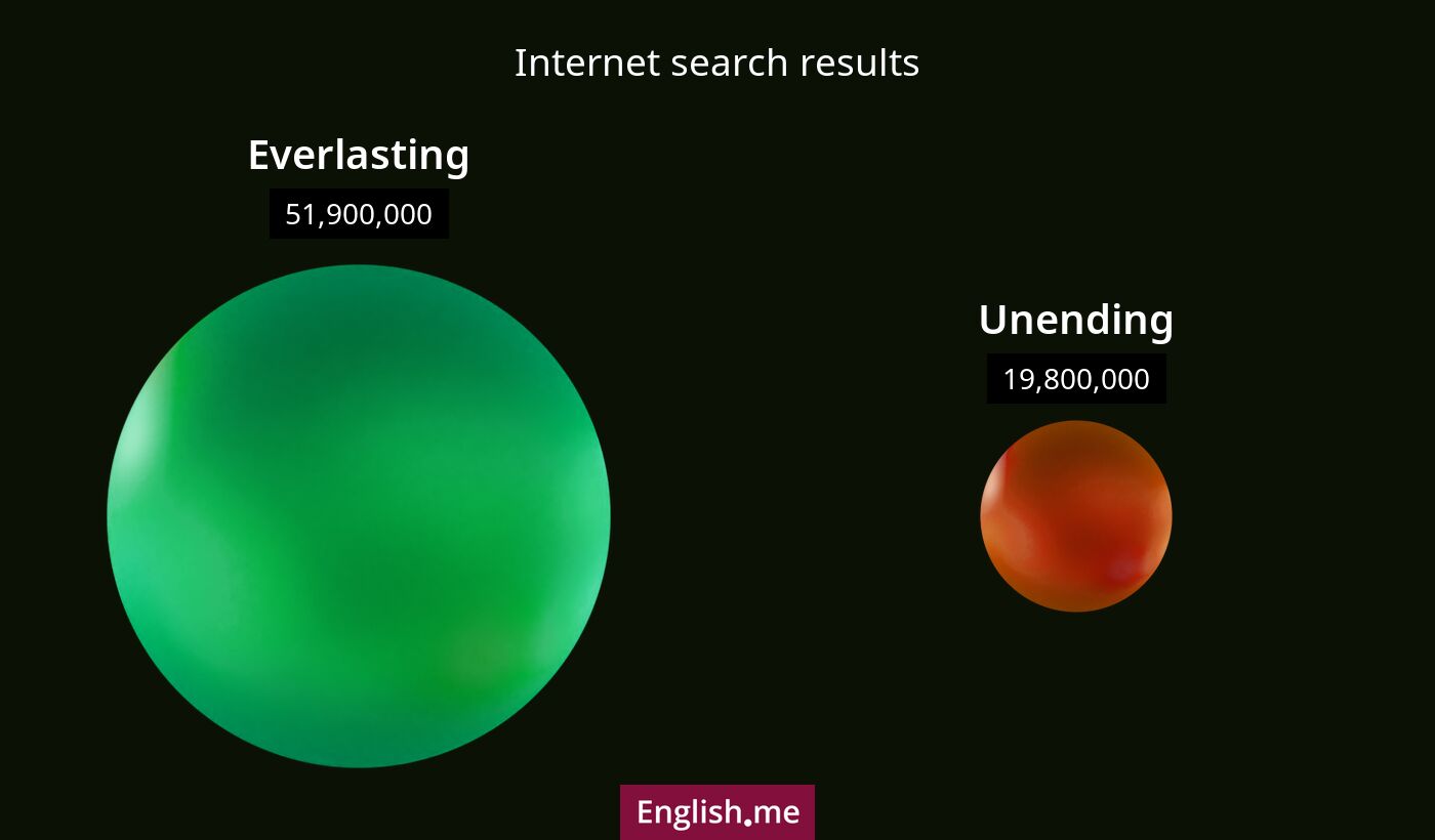 Les mots "everlasting" et "unending" suggèrent tous deux une continuité ou une durée sans fin. Ils décrivent quelque chose qui ne s'arrête jamais ou qui perdure indéfiniment.