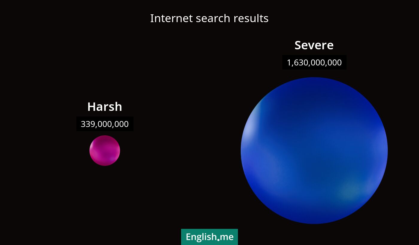 Les deux mots "harsh" et "severe" peuvent être utilisés pour décrire quelque chose de difficile, de dur ou causant de la souffrance. Ils indiquent une intensité ou une rigueur dans ce qu'ils décrivent.