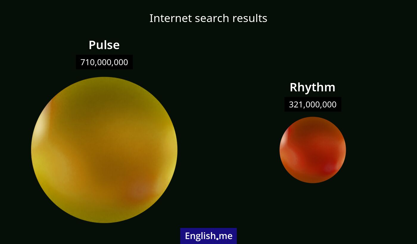 Les deux mots, "pulse" et "rhythm", se rapportent tous les deux à des concepts associés à la régularité et à la mesure dans le contexte de mouvements, de sons ou de phénomènes physiques. Par exemple, tous les deux peuvent être utilisés pour décrire des aspects de la musique.