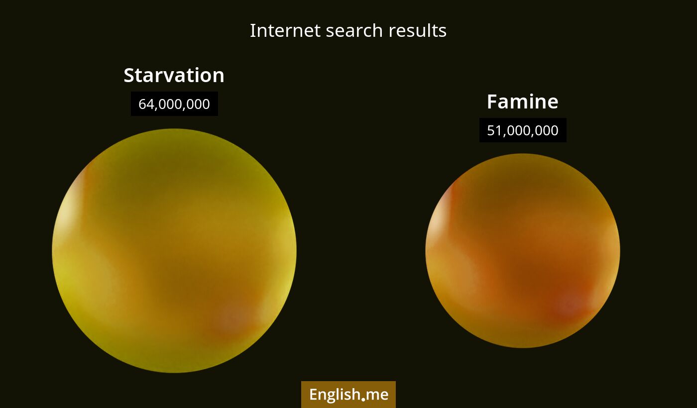 Les mots "starvation" et "famine" se réfèrent tous deux à une privation extrême de nourriture, entraînant des souffrances et éventuellement la mort. Les deux termes peuvent être utilisés pour décrire des situations graves liées à l'insécurité alimentaire.